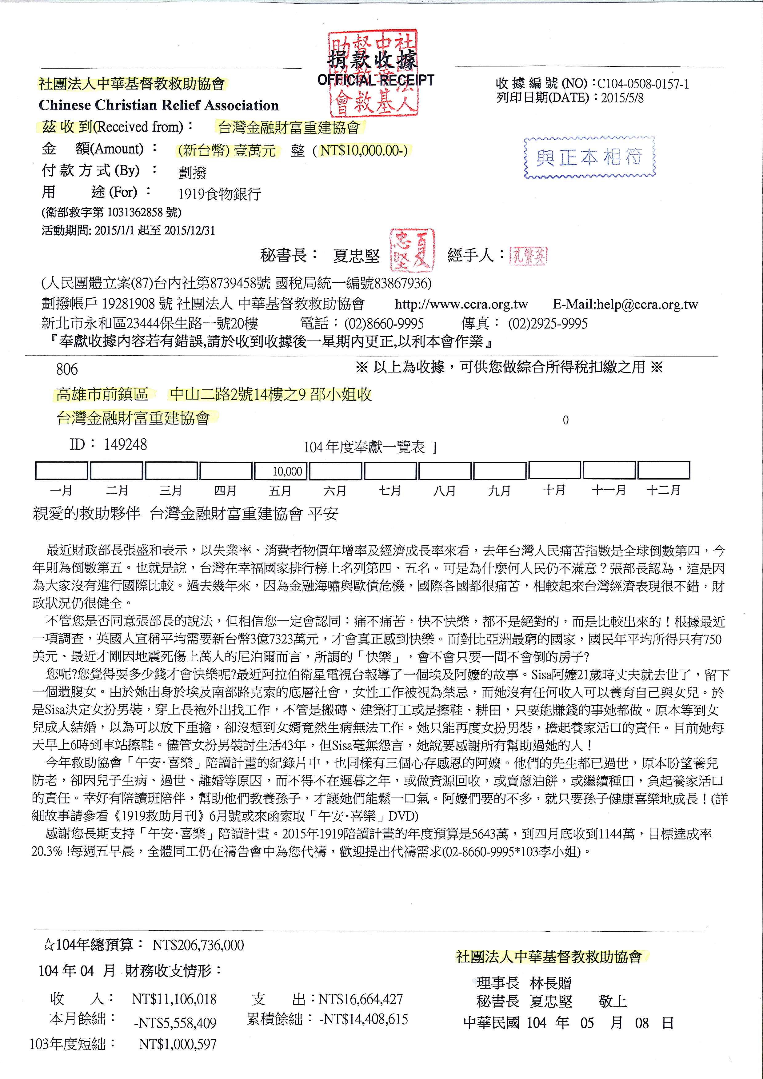 中華基督教救助協會-「1919社服與救助網絡」協助急難救助者