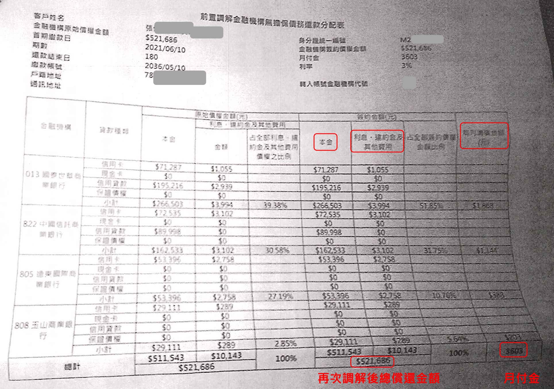 單親媽媽張小姐因扶養未成年子女,收入不足的情況下長期負債,積欠近60萬的債務,其後透過本會的協助輔導進行「前置調解」,經台中地院調解後取得180期3%利率月繳3603元的清償方案成功解決債務問題,恭喜張小姐!!!